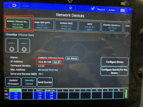 Find the IP of the 10Scene Store or GeNetix node using QuickQ or MagicQ Console or Rack QuickQ via Main Menu, Network Devices, MagicQ via NetManager.
