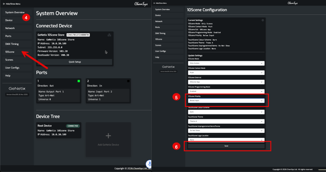 Now, when a console outputs DMX to the 10Scene Store or Node over network DMX ACN or Art-Net, the console will be in control because it has priority.