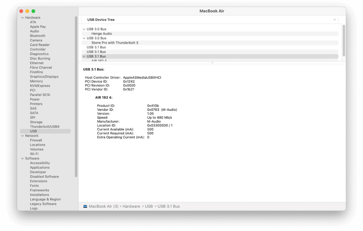 - In the window that opens, select USB in the sidebar — at the top of the main window, you will see USB buses listed, one for each USB port on your Mac. Choose one of the USB buses and you should see all the devices connected to it beneath. If the device isn’t there, try another.